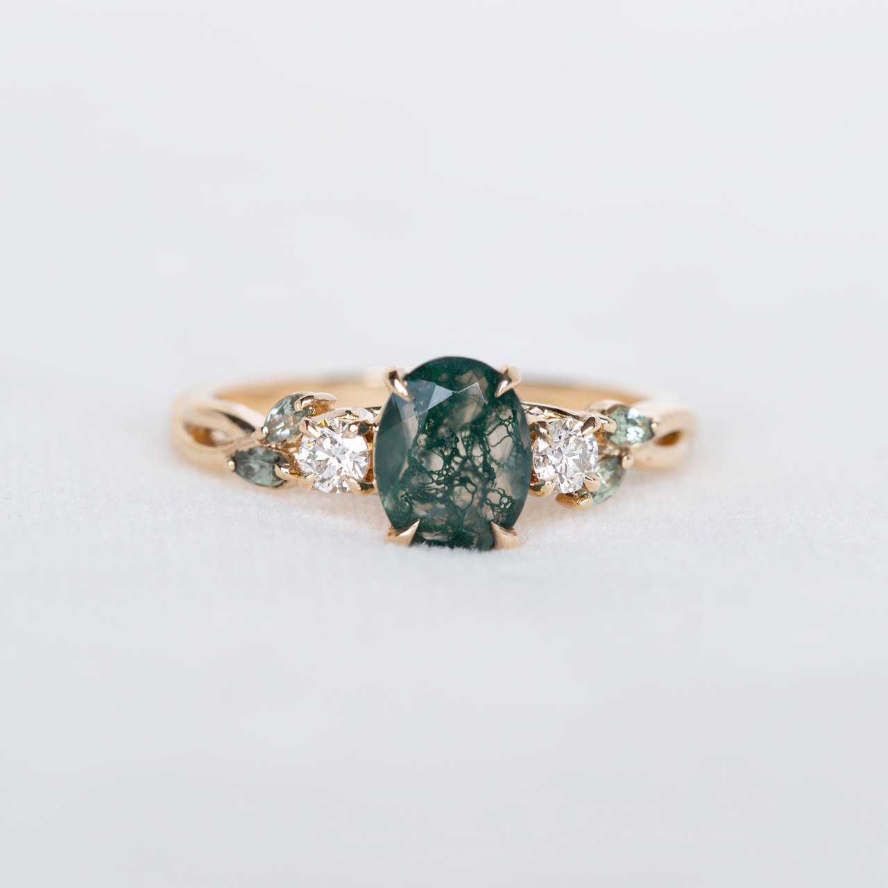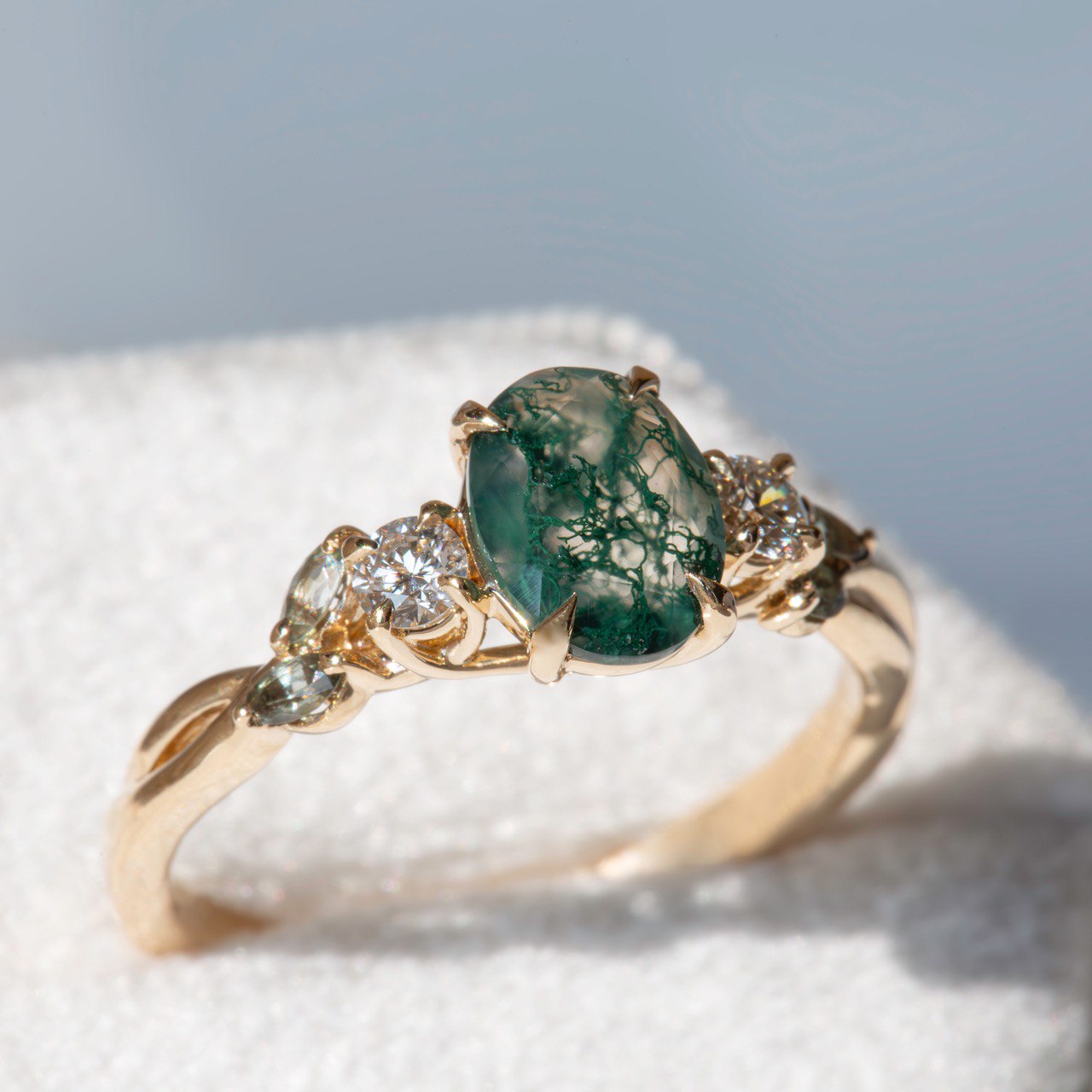 Moss agate is a variety of chalcedony with inclusions that resemble moss or foliage, giving it a unique and earthy appearance. Moss agate rings are prized for their natural beauty and organic pattern,making each ring truly one-of-a-kind. Moss agate engagement rings are perfect for those who appreciate nature-inspired designs and want a distinctive symbol of their love and commitment.