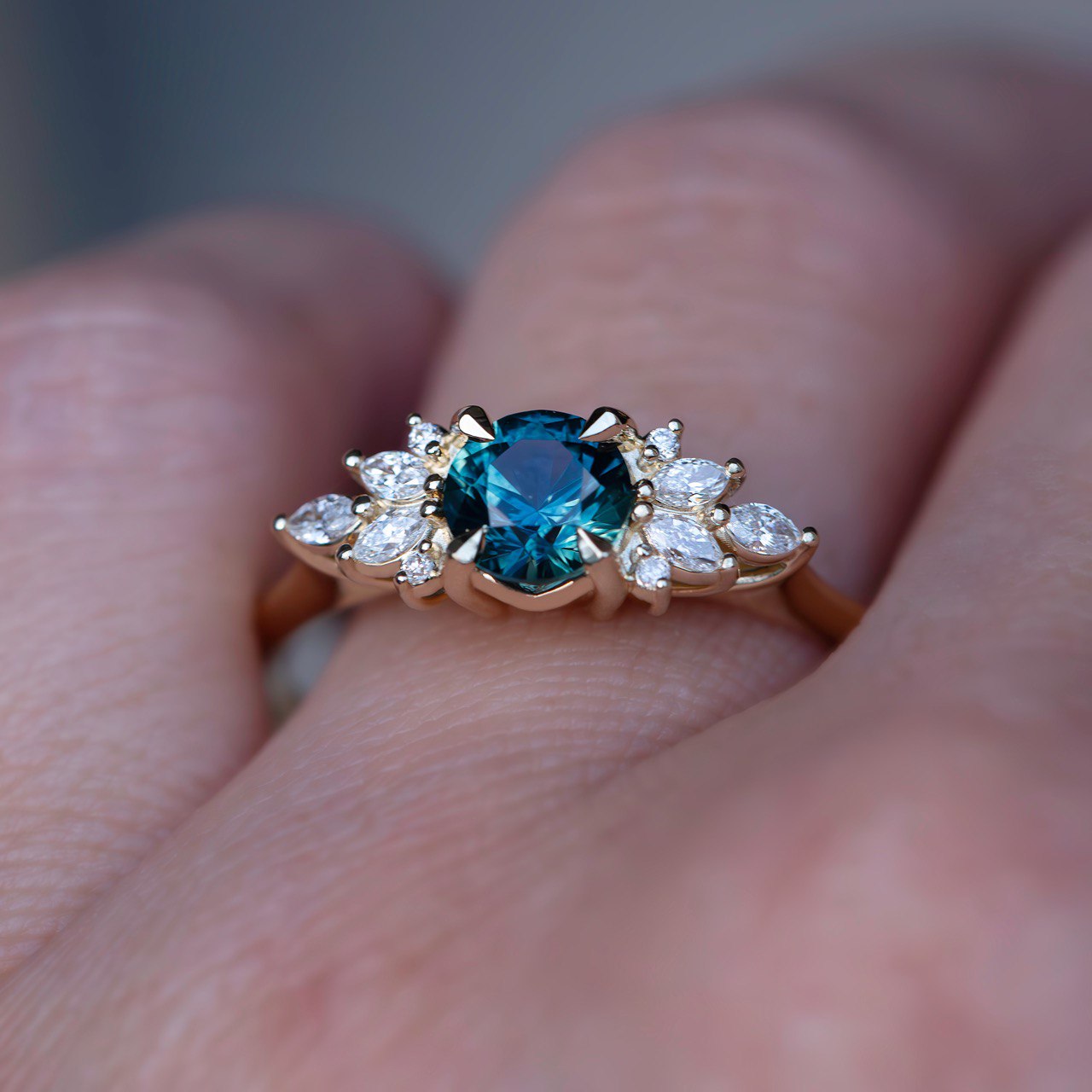 Our floral ring is featuring a beautiful teal Montana sapphire adorned by marquise and round diamonds.