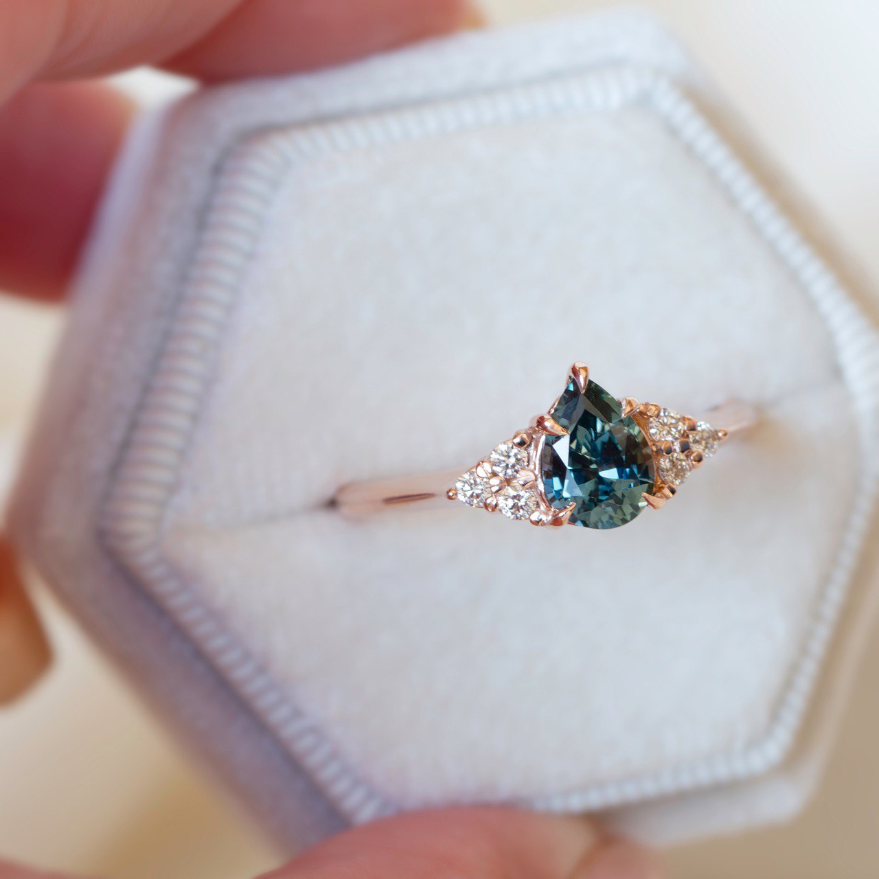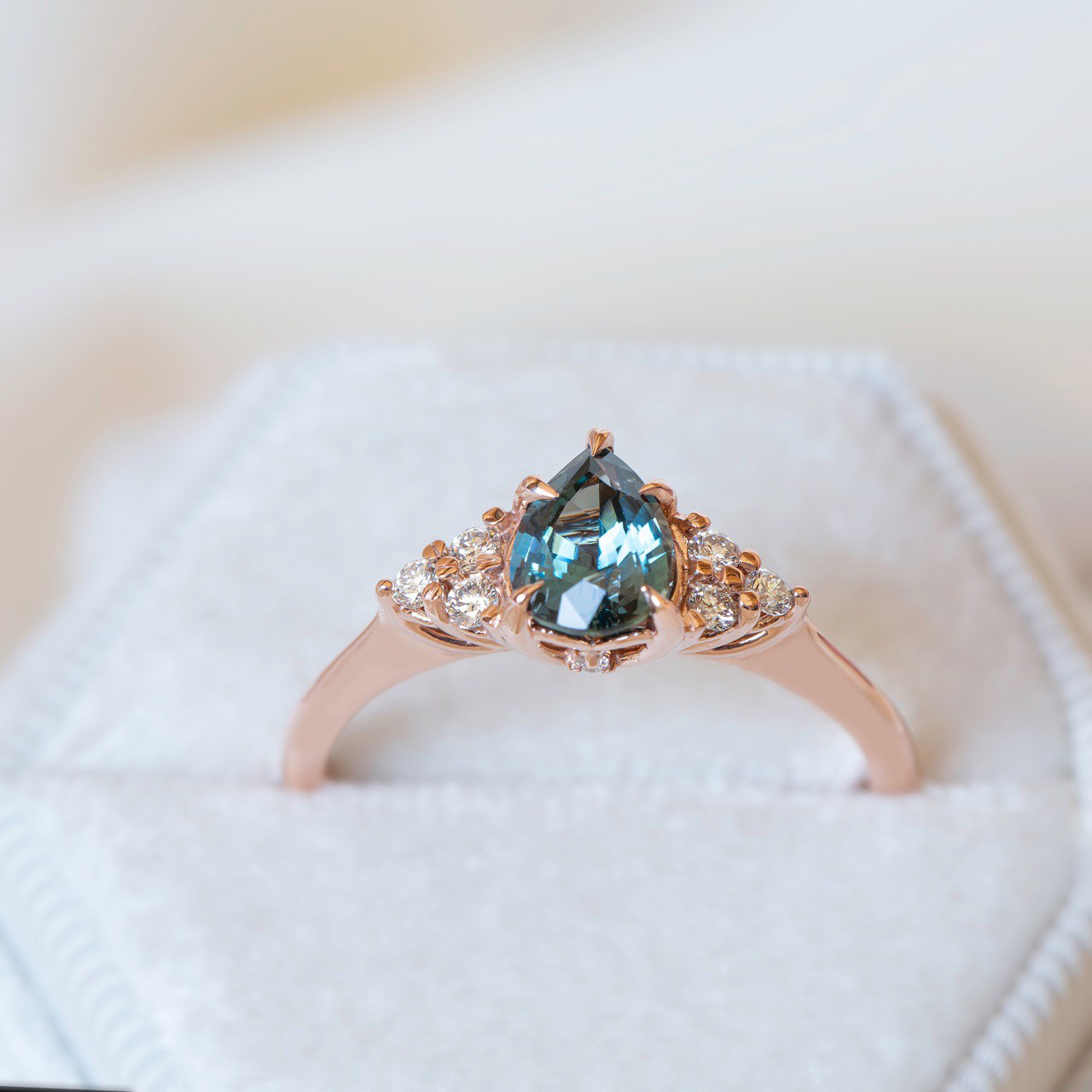 Central Stone: Teal Green Sapphire Pear Shape 1.1-1.3 ct