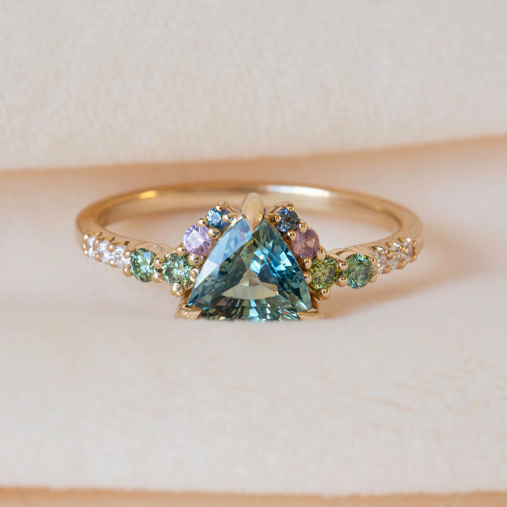 Teal Sapphire Cluster Engagement Ring, Multi Stone Ring 14K Gold, Trillion Sapphire Engagement Ring