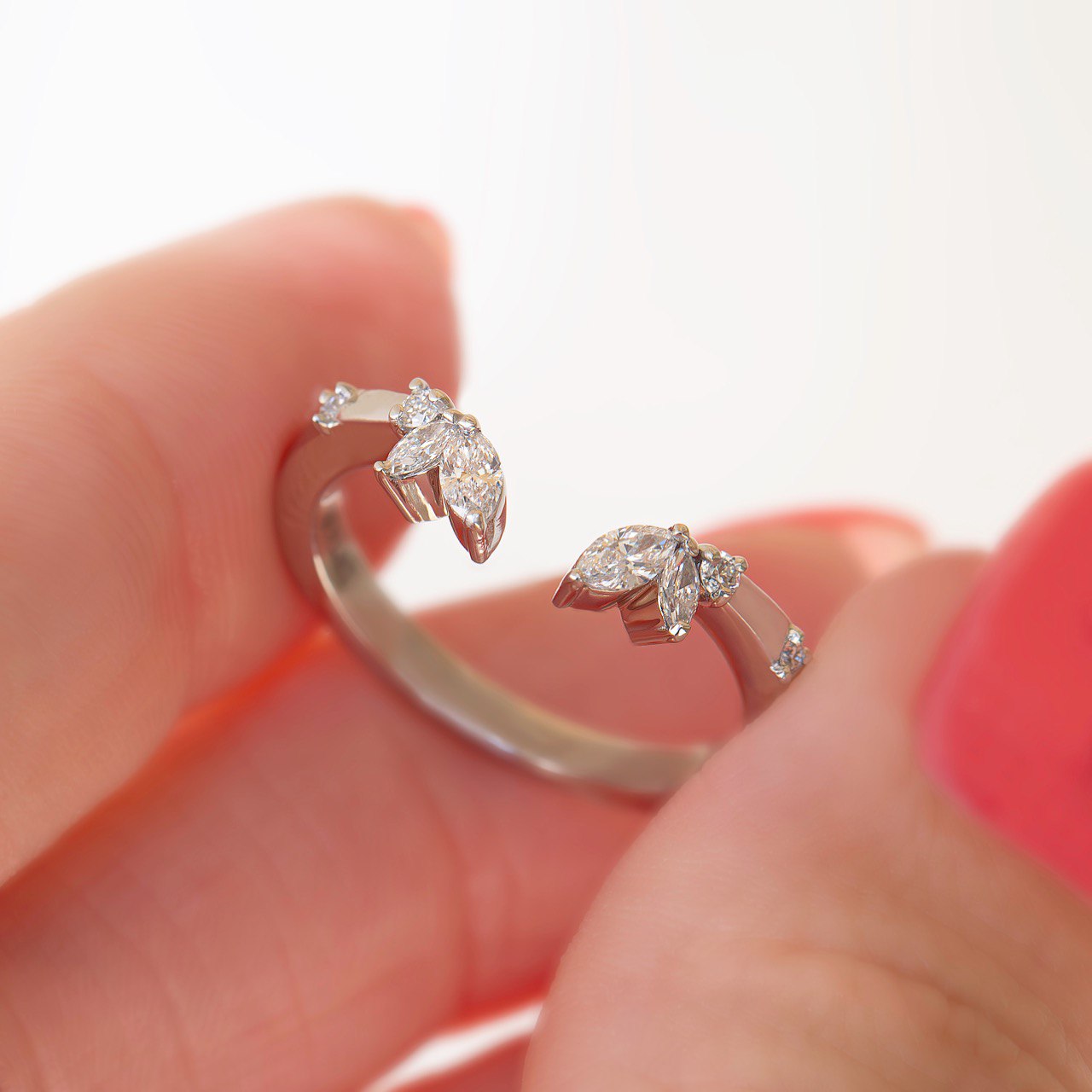 • Design Style: Nature-inspired floral ring with leaf-shaped prongs and matching contour wedding band
